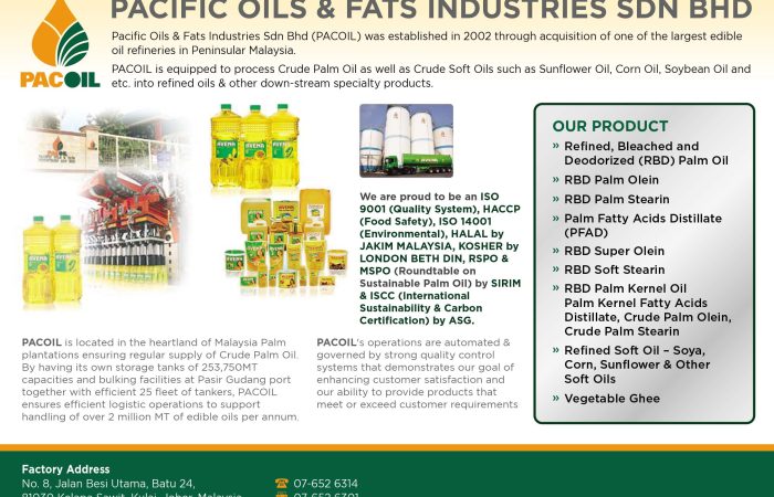 Pacific Oils and Fats Industries Sdn Bhd Mills / Refinery Tel : +607-652 6314/ Fax : +607-652 6301 No. 8, Jalan Besi Utama, Batu 24, 81030 Kelapa Sawit, Kulai, Johor Save Submit Review Share Share This Post facebook twitter linkedin google pinterest Description Photos Maps Reviews Description Contact : Syed Mohammad Hussain (Director) Nature of Business : Refinery – Manufacturing of vegetable oils (cooking oils) & its devivatives. Photos Maps Map Street View Get Directions Add Review & Rate Reply comment Cancel replyName Email Save my name, email, and website in this browser for the next time I comment. Be the first to review “Pacific Oils and Fats Industries Sdn Bhd” Cancel reply Quality Location Name Email Save my name, email, and website in this browser for the next time I comment. Review Close Business Info Get Directions No. 8, Jalan Besi Utama, Batu 24, 81030 Kelapa Sawit, Kulai, Johor Tel : +607-652 6314/ Fax : +607-652 6301 Statistic 295 Views January 7, 2025 Nearby listings Find more Mills / Refinery near Pacific Oils and Fats Industries Sdn Bhd Browse Nearby Agriculture Fertilizer / Chemical Food / Manufacturing Machinery / Service Provider Oil Palm/Nursery Plantation Show all Contact Business Send Message